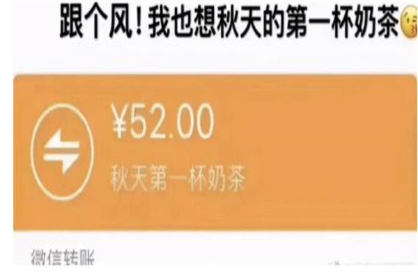 奶茶52一杯所指的也是秋天的第一杯奶茶,这个梗主要就是用来秀恩爱的,指对方愿意给你发52元的红包让你喝奶茶,适用于很多亲密关系的人之间,有的时候并不是一定要收到红包,而是想要知道这个人是在意你的,心里是有你的,秋天的热乎奶茶很暖身,但是那个人给你买的心意更是暖心里。