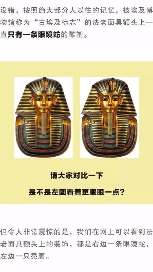 一只鹰一条蛇在一起,从逻辑上来说这个就很怪异啊,从美学来说也是,很多的卡通动画,cos衣服,都没有出现过2个动物的造型,都是额头一条蛇,如果法老面具本身是2个动物,为什么大家模仿起来要去掉一只呢?