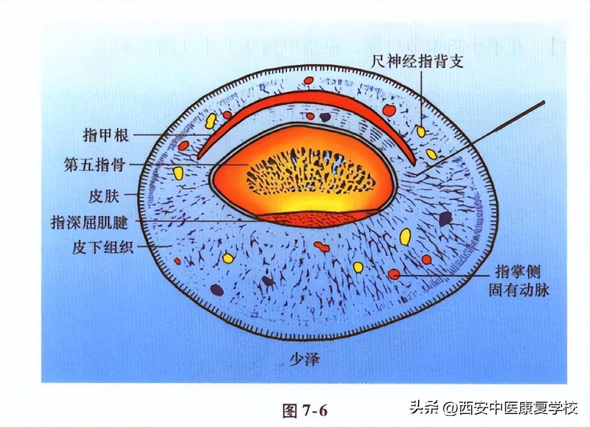 【穴位解剖】 皮肤→皮下组织→指甲根。皮肤由指掌侧固有神经的指背支分布。在上下组织中,除皮神经外,还有直接从掌浅弓发出的小指尺侧动脉,指掌侧固有动脉的指动脉、掌背动脉的指背支等以及同名的神经,在纤维束连于皮肤与骨膜之间的“闭密间隙”内形成各自的吻合状结构(图7-5)。