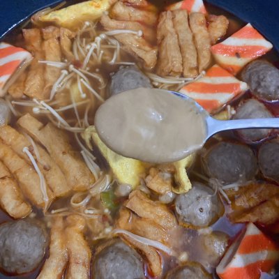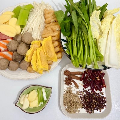 各种喜爱的食材: 各种丸子 200克 土豆 1个 莴笋 100克 金针菇 150克 豆腐串 2串 空心菜 适量 娃娃菜 适量 配料: 姜葱蒜 适量 八角 2个 桂皮 1小块 干辣椒 10个 小茴香 适量 花椒 适量 调料: 郫县豆瓣酱 2勺 生抽 2勺 料酒 1勺 白糖 半勺 花生酱 1勺