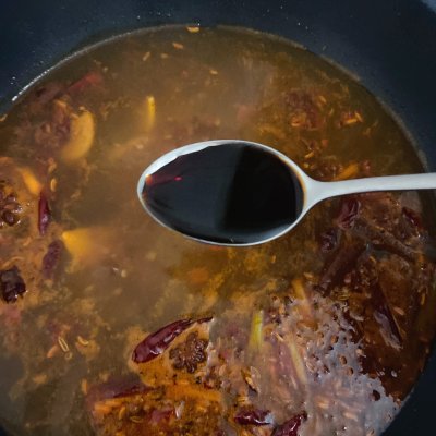 5、加入清水烧开,加2勺生抽、半勺白糖调味,加盖煮5分钟煮出香料味