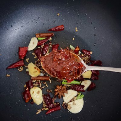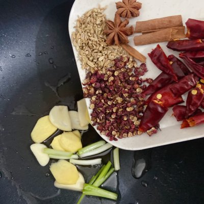 2、热锅冷油,倒入葱姜蒜和香料小火炒香