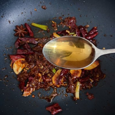 4、加入1勺料酒炒香