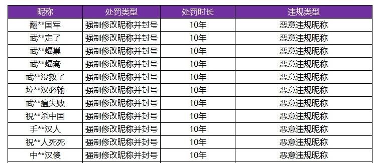 比如说前段时间关于新冠疫情的ID,有些不理智的玩家或许在家里憋疯了,不惜修改侮辱疫情或者辱华ID,天美官方直接对这类玩家做出最严厉处罚——封号十年!一般正常人想必也不会取这样的ID,所以封号是十年完全不用同情。