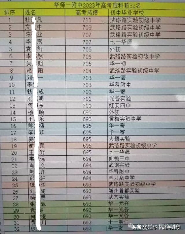 来来,用数据说话,看看2023年华师一附中高考理科前32名的出口,有多少是武汉市生源贡献的,有多少是专县生贡献的。