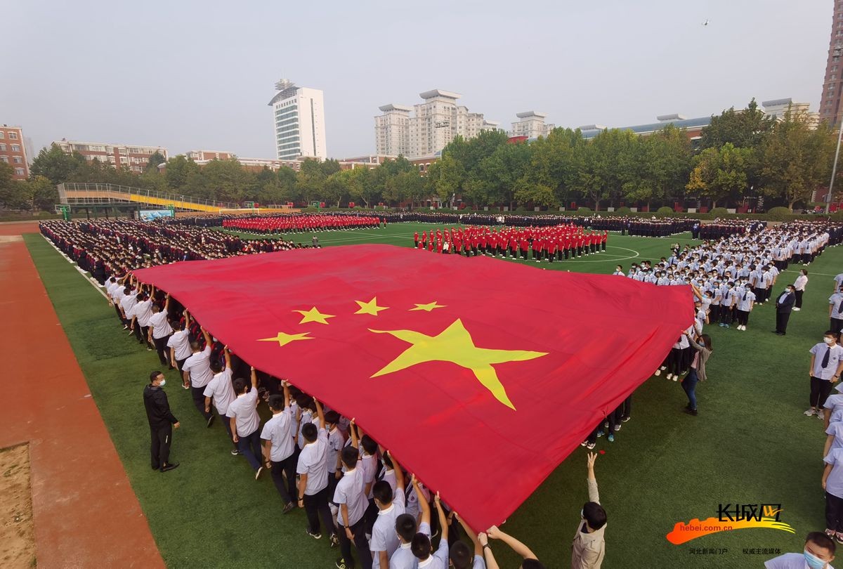 9月27日上午,在石家庄外国语教育集团初、高中的升旗仪式上,371名同学摆出“中国”字样的方阵,为祖国母亲献礼。
