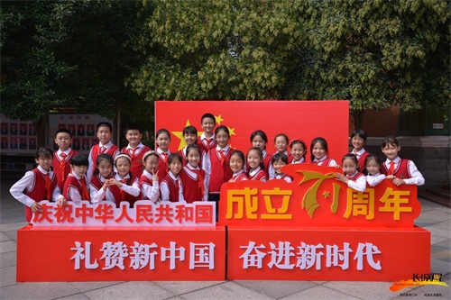 石外集团的小学生们挥舞着国旗提前为祖国“庆生”。