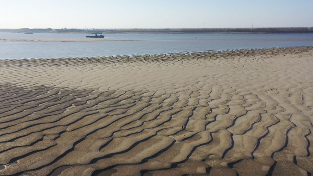 沙洲是由水流、波浪堆积作用形成的堆积地貌。近日,退潮后的长江江南镇鸭栏码头段露出大片沙洲,形成大大小小的沙丘,分布在水岸,成为一道奇妙的江水沙画,吸引了不少游客前来打卡游玩。