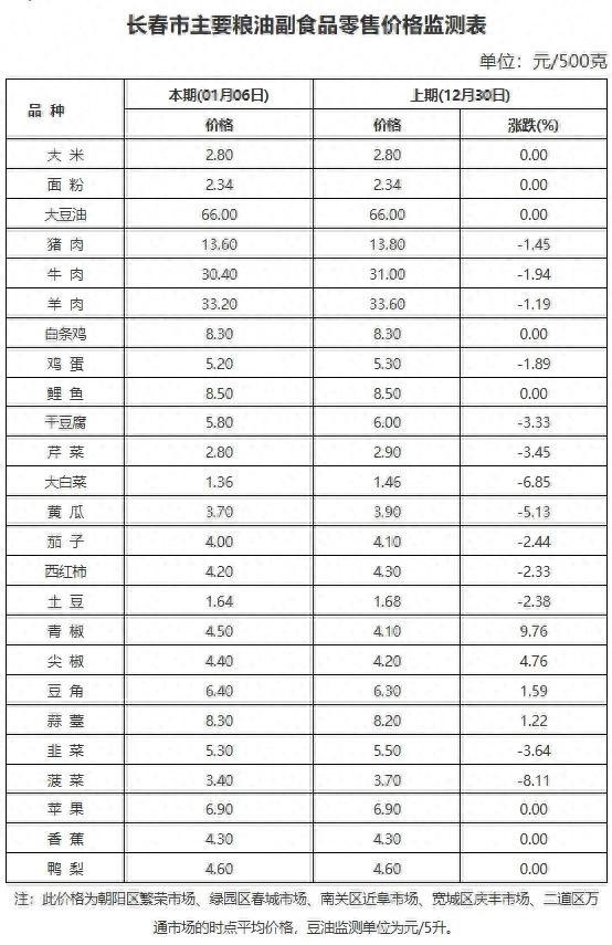 据五大农贸市场监测数据显示,元旦前长春市重要生活必需品市场货源储备充足、流通渠道畅通,可以满足市民的消费需求。今日(1月6日)与上周一(12月30日)相比,粮油、水果价格平稳,猪肉、鸡蛋、蔬菜价格下降。