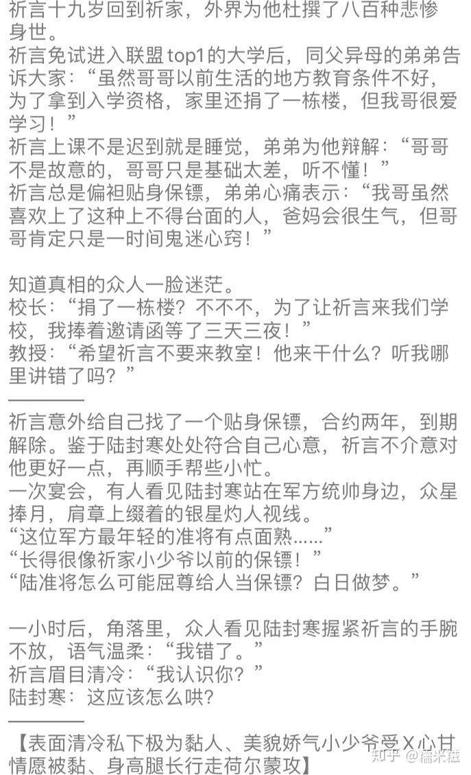 衍夏书评:还在连载中 祁言是个天才 聪明绝顶 常年位居敌方暗杀名单第一位 陆封寒是将军 是祁言一个人的保镖 作战的时候两人经常虐狗 部下们被硬塞狗粮 中间一段小虐 不长 看祁言写程序写编程做系统做武器真的很爽 神仙脑子