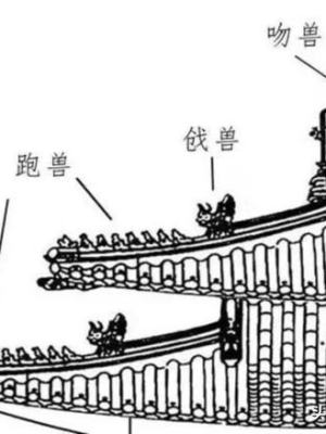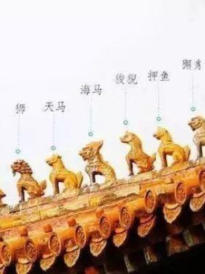 这些神兽一般叫做屋脊走兽、檐角走兽、仙人走兽、垂脊吻等,古建行内部也称为小跑或“走投无路数量”。它们已经“走”到了檐角的最前端,再向前一步就会掉下去,真的是走投无路的。把这些小兽依次排列在高高的檐角处,象征着消灾灭祸,逢凶化吉,还含有剪除邪恶、主持公道之意。古人把建筑装饰上这些走兽,使古建筑更加雄伟壮观,富丽堂皇,充满艺术魅力。 这些神兽排列有着严格的规定,按照建筑等级的高低而有吉祥兽数量的不同, 在小仙人之后,坐姿排列着一队小动物,根据建筑规模和等级不同而数目有所不同,多为一、三、五、七、九等单数,最多故宫太和殿在最后增加了一个行什。数目越多,表示级别越高。拿故宫来说,太和殿用了十个,天下图片无二;皇帝居住和处理日常政务的乾清宫,地位仅次于太和殿,用九个;中和殿是用七个;坤宁宫原是皇后的寝宫,用七个;妃嫔居住的东西六宫,用五个;某些配殿,用三个甚至一个。