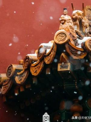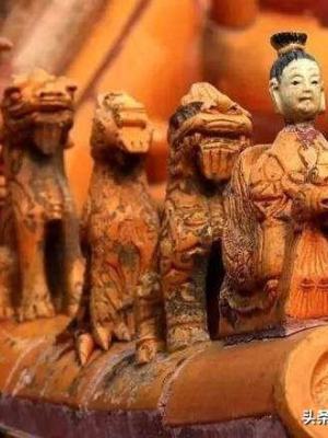 其实骑凤仙人的形象很早就有了,宋代官方颁布的建筑设计和施工的规范书《营造法式》中把这个仙人叫做嫔伽(pín qié),是一个半人半鸟的人,上身是个美女,背后长着一对巨大的翅膀,手里托着一个放着金光的盘子,就像是仙界的礼仪小姐。随着时代的变迁,到明清时期,就转化成了骑凤仙人的形象。古建上将骑凤仙人安排在首位,表示腾空飞翔并有祈愿吉祥意。而建筑本身的作用,则是固定垂脊下端的第一块瓦件。紫禁城宫殿屋顶檐角上所塑造的琉璃“仙人走兽”,不仅仅只是帝王宫殿上的装饰物,而且顶上还是屋顶防止雨水侵蚀渗漏和松散脱裂的重要建筑部件,是古代匠师们把实用构件与艺术造型巧妙地结合起来的经典之作。仙人”没有名字,“凤”也是朴素的,但它带领着身后名声赫赫的龙、凤、狮、马等占据着所有华丽宫舍的每一条蜿蜒垂脊,构成了中华古建最具标志性的天际线。在老百姓那里,它还有个更亲切的名字,叫“仙人骑鸡”。是的,它就是在华夏恢弘的建筑上,亘古不移地端顺序坐在屋脊最前端的那尊塑像。唐宋时,还只有一枚兽头,以后逐渐增加了数目不等的蹲兽,到了清代形成了今天常见的“仙人骑凤”领头的神兽列形态。