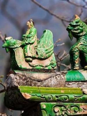 十只神兽在屋顶上站成一排,而领头的则是〝骑凤仙人〞。关于〝骑凤仙人〞则有两种不同的传说,传说一是:在春秋战国时期,齐国国君齐王,一次在作战中大败,来到一条大河岸边,后边追兵就要到了,他走投无路。危急之中,突然一只大鸟飞到跟前,齐王急忙骑上大鸟,渡过大河,逢凶化吉。传说二,则是据说这位仙人是姜子牙的小舅子,一心想飞黄腾达,但是他的才能有限,姜子牙便对他说:〝你的官已升到顶了,如果再往上爬就会摔下来了。〞古代的建筑师们就根据这个传说,把他放在了屋檐角的最前端,如果再往上爬一步就会掉下去摔得粉身碎骨,所以对于名利欲望要适可而止,小心提前享尽此生福报,招致祸患。