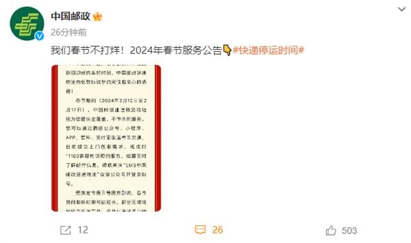 今日,中国邮政发布2024年春节服务公告,并宣布春节不打烊。