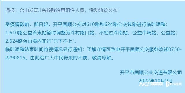 南都讯 记者严亮 10月9日,开平市国顺公共交通有限公司发布消息,受疫情影响,即日起,开平国顺公交对610路和624路公交线路进行临时调整:1.610路公益首末站暂时调整为泮村路口站,不经过泮南站、公益市场站、公益站;2.624路台山境内实行“只下不上”。临时调整结束时间将视情况另行通知;了解详情可致电开平国顺公交服务热线0750-2290816。