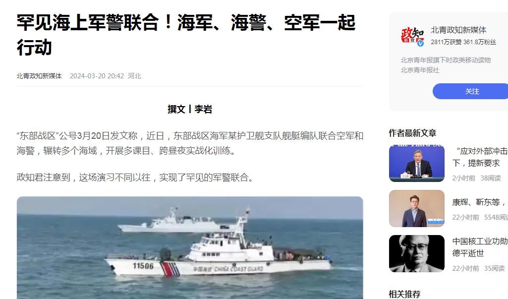 北青政知新媒体,罕见海上军警联合!海军、海警、空军一起行动