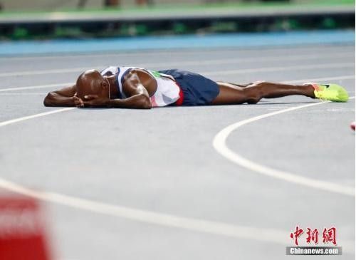 里约奥运男子万米决赛,英国选手法拉赫被绊倒后继续比赛,并成功卫冕奥运万米跑金牌。中新网记者 杜洋 摄