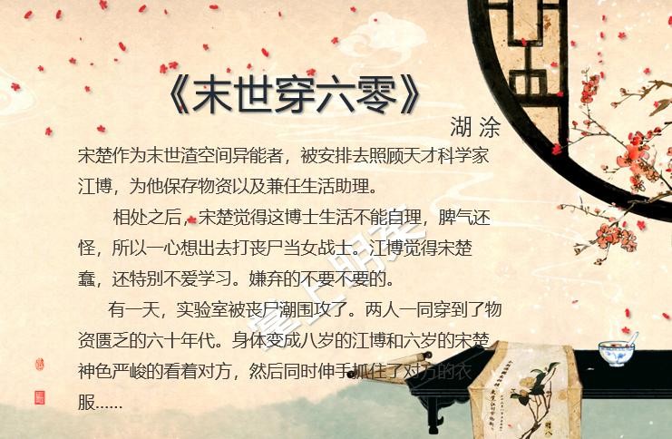 《末世穿六零》末世里的渣异能者宋楚和天才博士江博,因为丧尸潮的围攻,进入时空隧道穿到了六十年代,成了八岁的江博和六岁的宋楚,被当做流浪儿送到了当地公安局,并且找到了一对爹妈。原本以为可以过上吃穿不愁的日子,谁知道,在这个物资匮乏的时代,就算有了爹妈,也不一定能吃饱饭。还好宋楚的渣空间偶尔还有好用的时候。两个小豆丁合力赚票证,带着家人发家致富……宋楚:终于还是年幼的我们承担了所有。江博:没有“们”,是我扛下了所有……