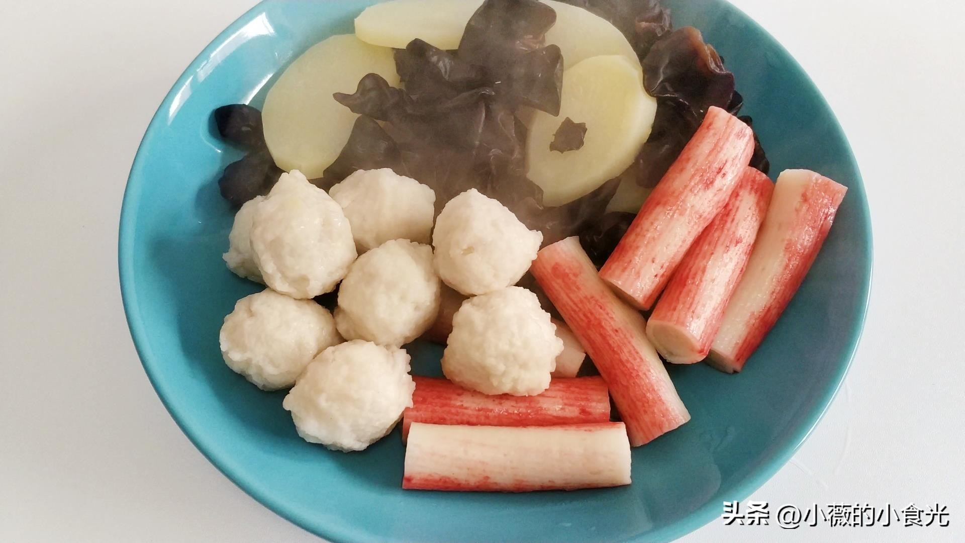 放入焯好的木耳、土豆、蟹棒和鱼丸,出锅前撒鸡精,并淋入香油