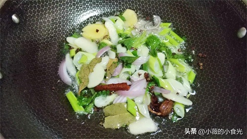 2棵洗净的香菜、1/3的洋葱丝、葱段、姜片、大蒜、1片桂皮、2片香叶、30粒花椒、1个草果