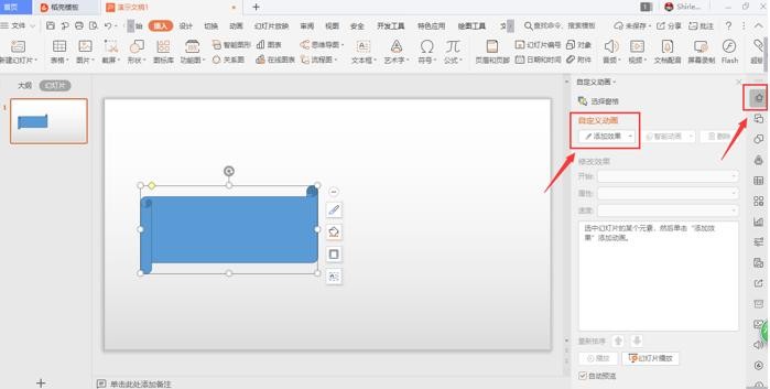 点击右边菜单栏上的自定义动画,选择【添加效果】,完成动画效果的设定: