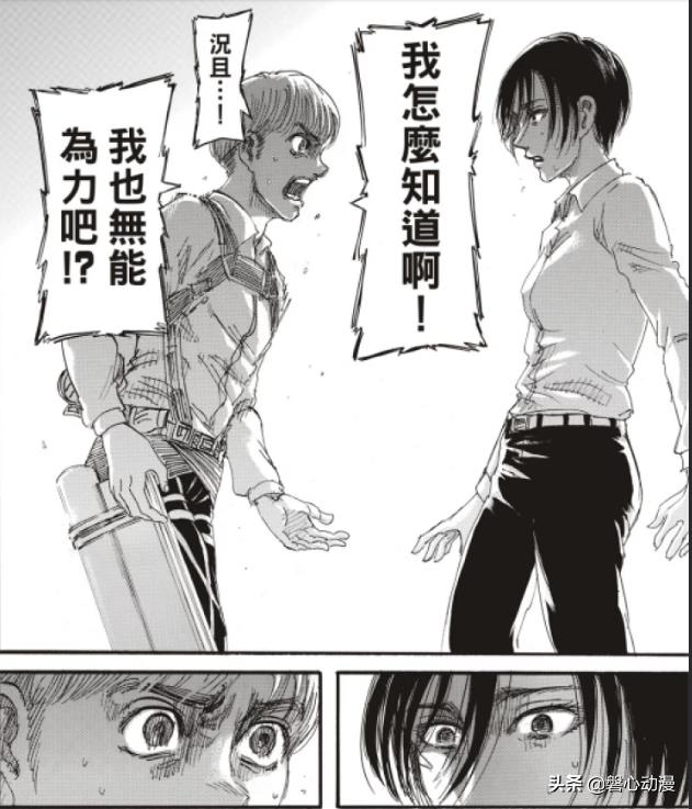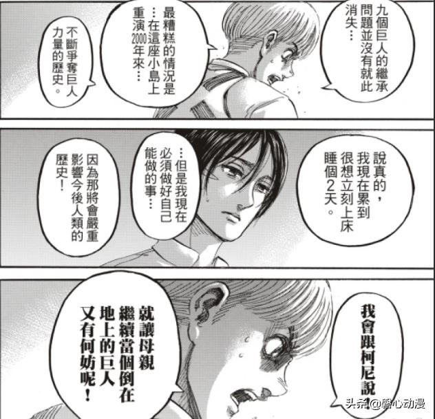阿尔敏于团长的差距也在于此,在这一话中阿尔敏也表示,当初真的应该救团长,在这种情况下团长一定会相处最完美的应对方案。也许团长比阿尔敏要强,但谁又能确保团长不会受到贝尔托特人格和记忆的影响呢?阿尔敏和阿尼有着说不清道不明的关系,这也是收到了超大局记忆的影响,但若是团长没事就去和阿尼唠唠嗑或者说产生感情,真的是感觉怪怪的。阿尔敏反而是最佳人选。并且阿尔敏在这话当中也展现了曾经没有冷酷的一面,这也算的上是一种成长吧,竟然说出了让科尼的母亲继续当个巨人这句话,若是放在以前,真的是很难以想象。