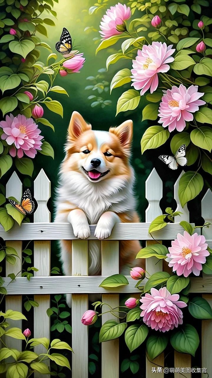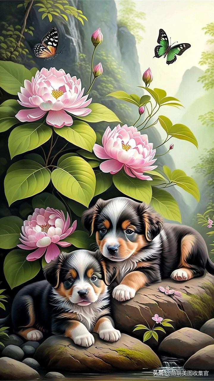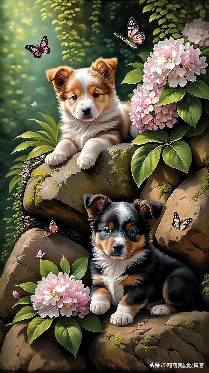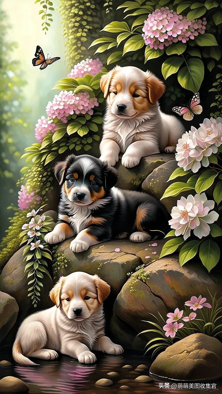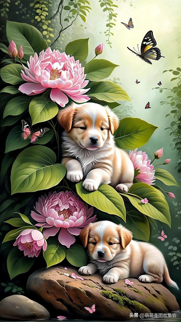 这些可爱的狗狗在花影间休息的情景,宛如一幅美丽的画卷,自在温馨,令人不自觉内心一片柔软,惊叹于一切都是如此的和谐与美好。