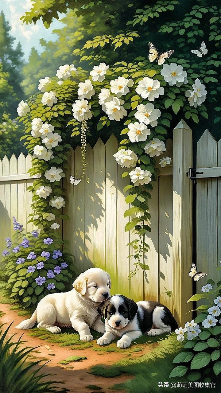 在这宁静的午后,可爱的狗狗们正悠然自得地享受着它的时光。它们身处一片缤纷的花影间,沐浴在温暖而和煦的阳光下,静静地闭上了眼睛。