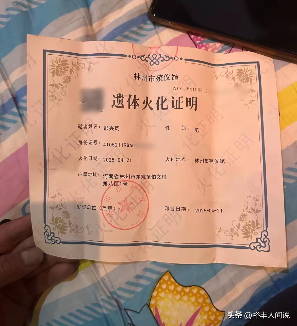 曝光的“火化证”中显示,串哥本名郝兴周,时间则位于21号,至于其具体去世的时间,根据其“侄子”透露的信息来看,应该是21号凌晨,原因则是突发疾病,至于诱发疾病的原因让人感动。
