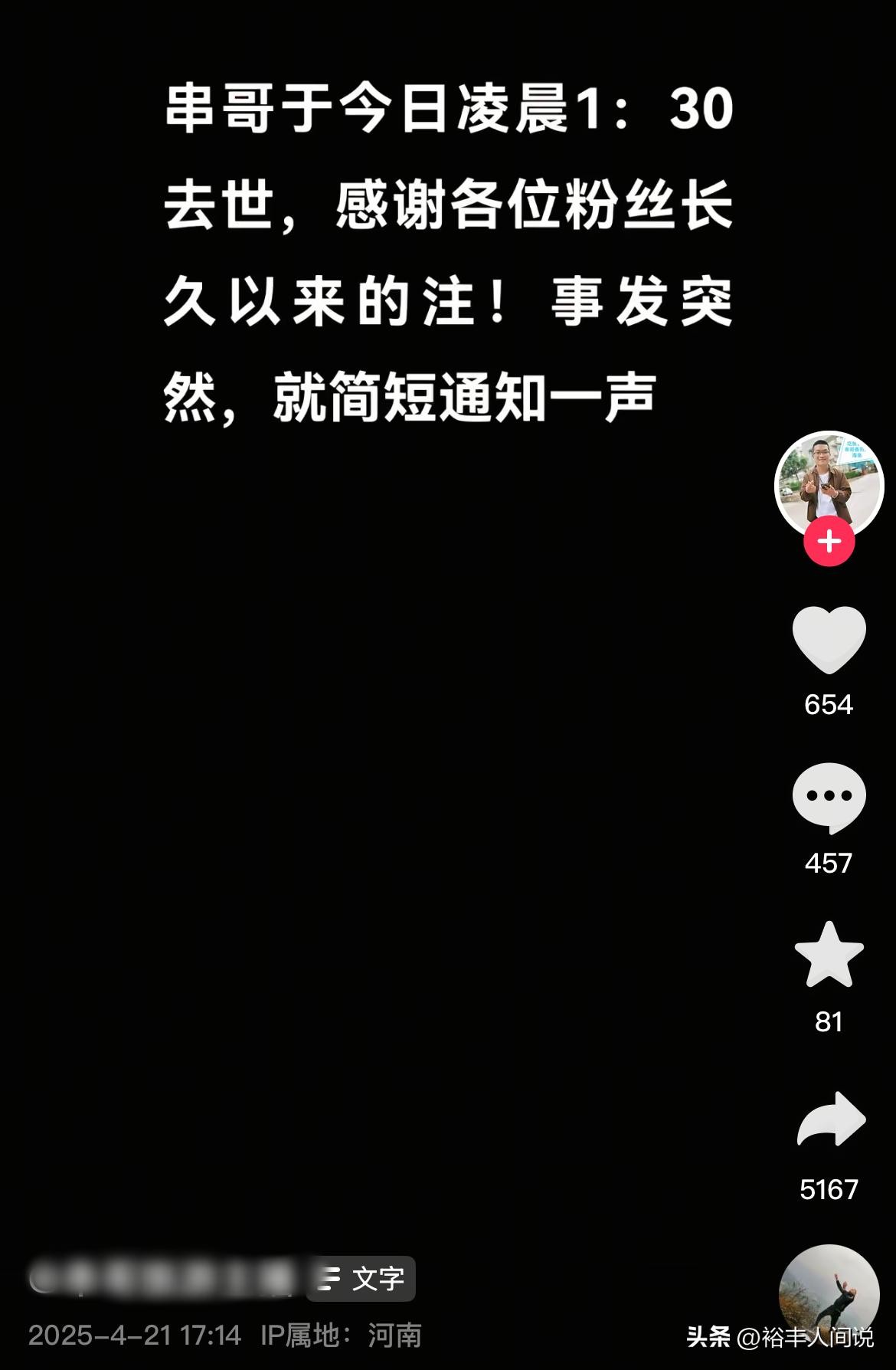 关于这一噩耗,串哥本人的视频账号也公布了相关的消息,并透露,网红串哥是在21号凌晨1点半去世的,事发突然,所以只是简单通知一下。