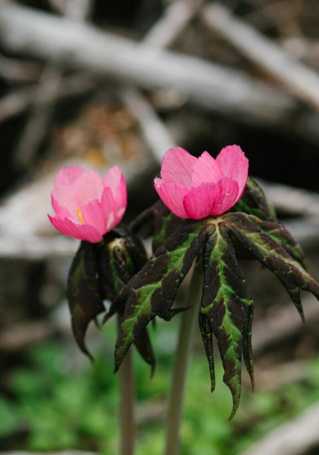 桃儿七叶2枚,薄纸质,非盾状,基部心形,3-5深裂几达中部,裂片不裂或有时2-3小裂,裂片先端急尖或渐尖,上面无毛,背面被柔毛,边缘具粗锯齿;叶柄长10-25厘米,具纵棱,无毛。
