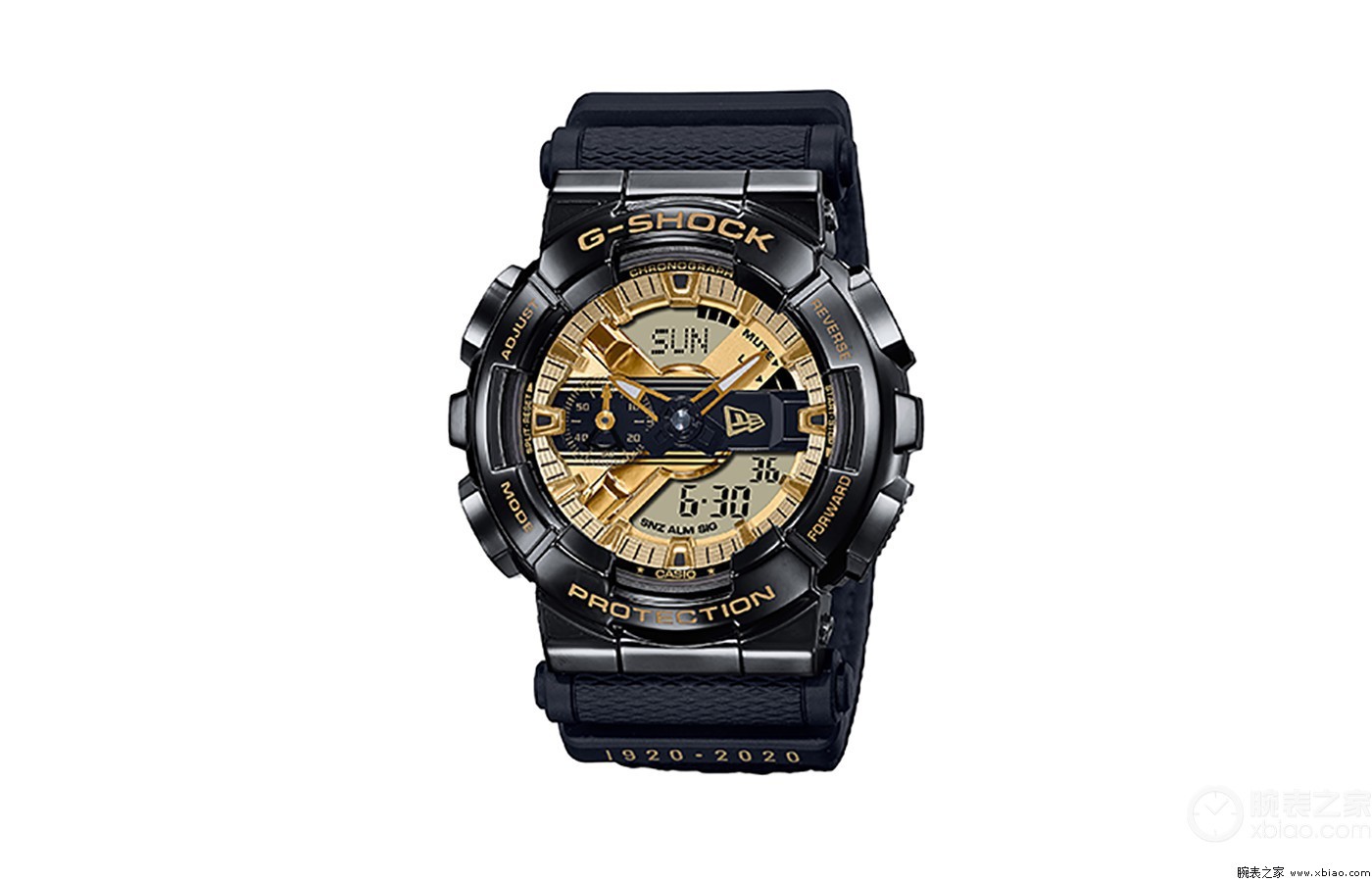 腕表点评:该款腕表是一直挑战韧性极限的G-SHOCK与NEW ERA®的联名款腕表。黑色和金色着色的表盘设计来自于标志性59FIFTY®帽舌上的贴纸图案。立体感十足的表盘搭配质感强烈的金属表壳,既展现时尚活力,又极具果敢无畏的精神,其具备的防磁防震、200米防水、自动LED照明、倒计时、全自动日历、48个城市世界时间等强大的功能特性,让其无愧于“小钢炮”的美誉。同时腕表背刻印有NEW ERA 100周年纪念标志,配有特殊款表纪念表盒。