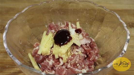 4、准备两片生姜切成细丝后,加入到肉末中,接着再加入少许料酒、一点点盐、适量鸡精、味精提鲜,并手抓拌均匀。