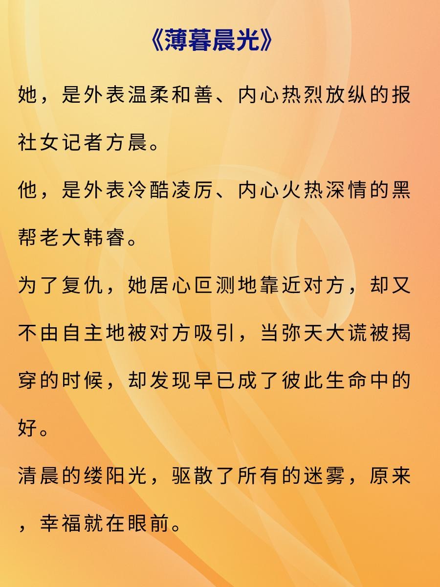 虽然本文男主韩睿是黑道的人,但这并非复仇故事,而是爱情故事。方晨是报社记者,怀疑其姐姐是被韩睿所杀,于是想潜伏在韩睿身边查找真相,没想到爱上了韩睿。