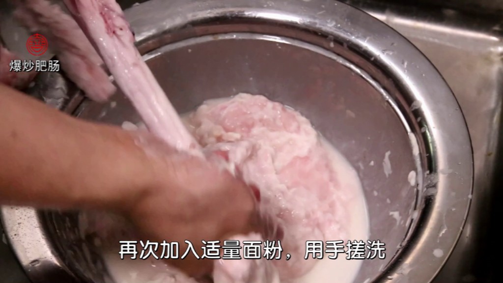 1、肥肠适量,放入盆中并加入适量面粉用手抓均,一节一节搓洗,再用水将肥肠表面的面粉洗净。找到肥肠头部翻转过来,再次用水一边冲一边往里塞,肥肠就翻过来了。再次加入适量面粉用手搓洗后洗净面粉,撕去肥肠内部多余的肥油,最后将肥肠翻转过来。