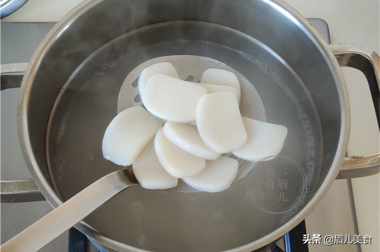 2、煮锅加入适量清水烧开,将年糕一片片的下入锅中,煮几分钟,直至年糕煮软煮透。