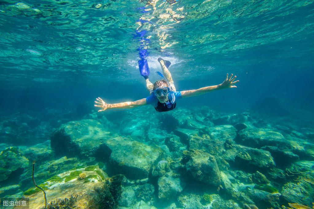 大堡礁风景优美,海面比较平静,海水清澈见底,隐约可以看见海底五颜六色的礁石。想要尝试浮潜的话必须要带穿戴好潜水装备,但是由于我们不需要潜到底,所以只要呼吸管和眼镜就可以了。当我潜下去后,第一眼看到的就是一片美丽的景象——大大小小、各式各样的珊瑚,五颜六色的鱼和身上满是刺的海胆。各色的小鱼从我身边游过,就像住进了五彩斑斓的海洋童话梦一般。