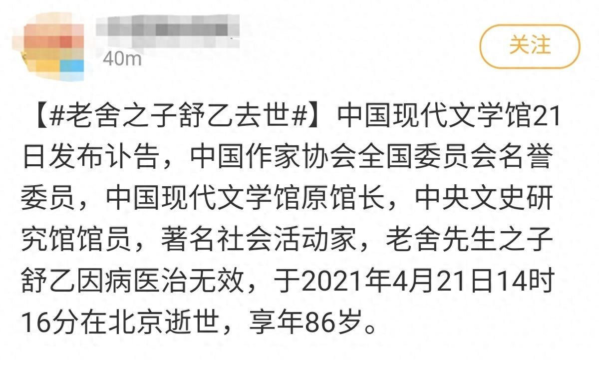 4月21日晚,有媒体在社交平台报道称老舍之子舒乙因病医治无效于今日二十一点在北京去世,享年86岁。