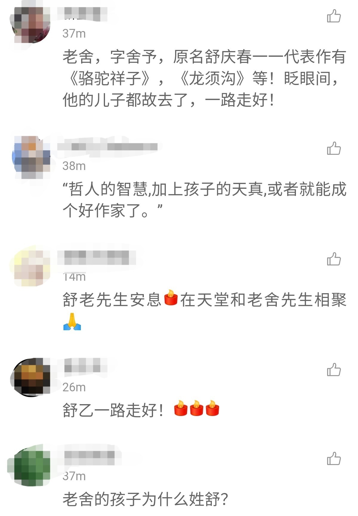 很多网友看到舒乙去世的消息后留言道“哲人的智慧加上孩子的天真,或者就能成个好作家了,舒老先生安息,在天堂和老舍先生相聚吧,老舍原名舒庆春,代表作有《骆驼祥子》,眨眼间他的儿子都去世了,一路走好。