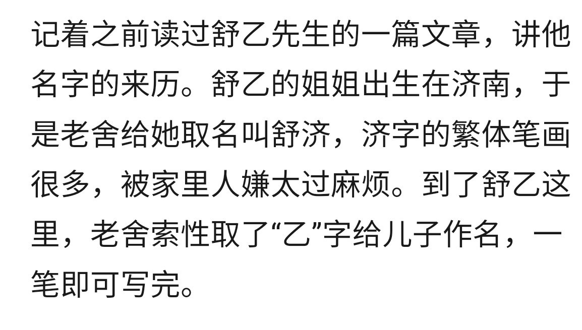 因为舒乙的父亲是老舍,而他叫舒乙,对此有网友揭其名字来源,出自舒乙曾写过的文章,书里表示“舒乙的姐姐叫舒济,济字的繁体笔画很多,被家里人嫌太过麻烦,所以给儿子取名乙,一笔就可以写完很简单”。看来舒乙先生的名字由来也是大有学问。