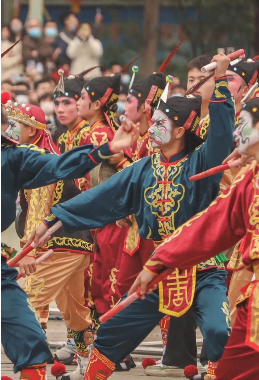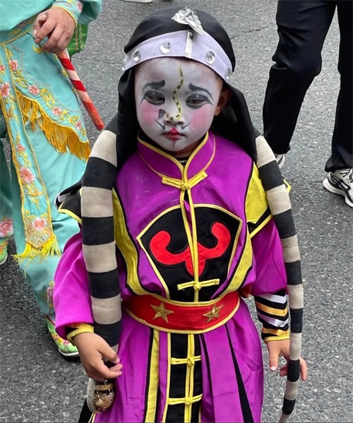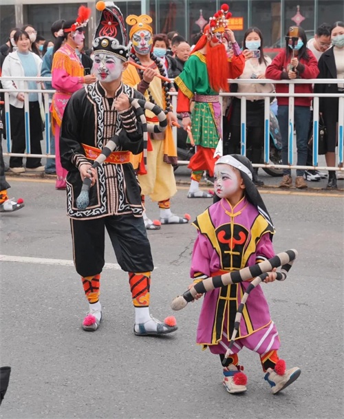 看过水浒的你肯定认出来了,没错就是时迁,水浒英雄108好汉排名107的时迁,那他为啥走第一个呢?时迁江湖人称“鼓上蚤”,上应“地贼星”,曾经是盗墓贼的祖师爷,担任走报机密点步军头领。潮汕英歌舞主要还原攻打大名府的故事,而时迁呢,是情报人员,站在队伍最前面,手中舞动的蛇既是一种信号,又来源于古代傩礼中祭祀所持的茅苇长鞭,用途是鸣鞭驱邪,同时表明英歌舞来自古老傩舞。