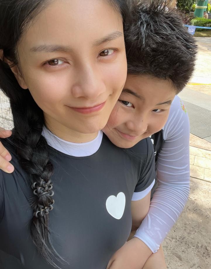 还有和小儿子的合照,小儿子明显要乖一点,也很可爱,他将头靠在妈妈的肩膀上,显得格外乖巧,不过这两兄弟是越来越像沙溢了。