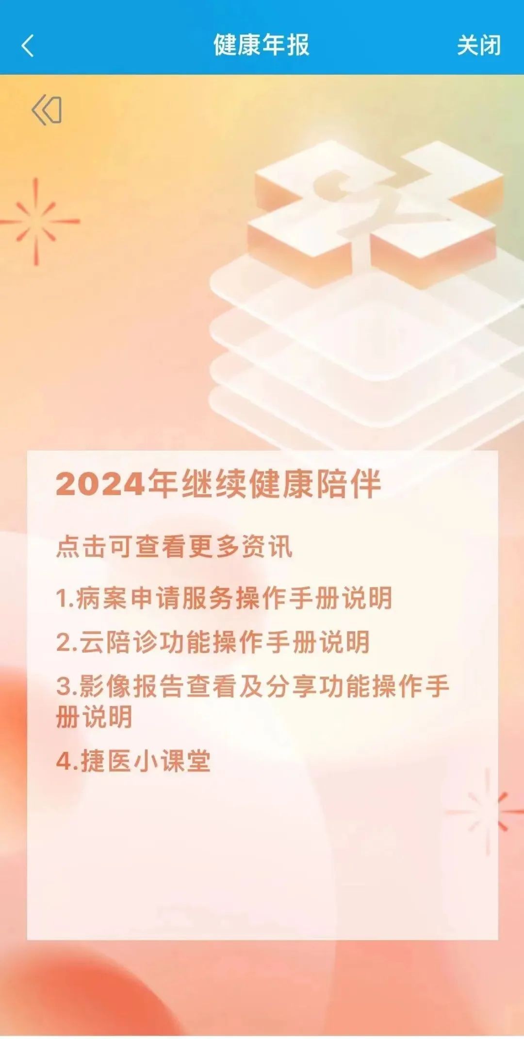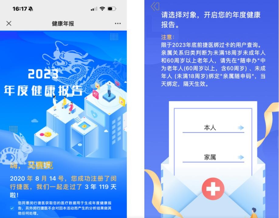 温馨提醒:登录“闵行捷医”APP或微信小程序,即可查看本人和亲属的2023年度健康年报。查看亲属健康年报需先在随申办”绑定“亲属随申码”,然后在闵行捷医”卡管理功能绑定亲属卡。