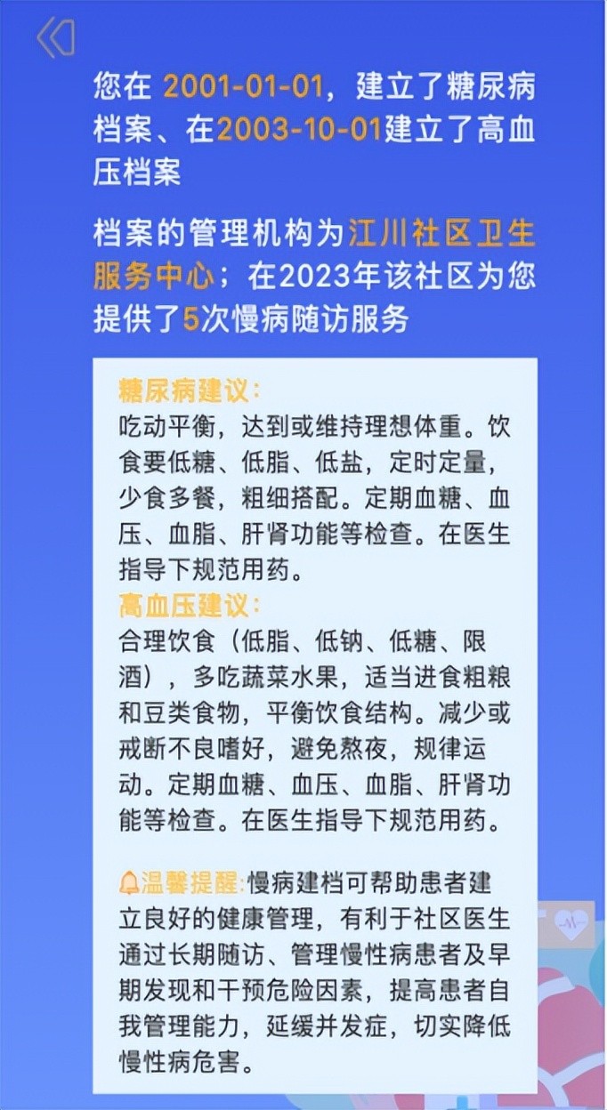 注意看哦,新增了个人慢性病档案情况、温馨建议及提醒,逐步提升自我管理能力。