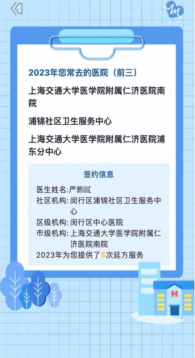 您常去的就诊医院一目了然;看看您的签约医院是否与常去医院相符,如需调整签约医院请与签约医生联系。