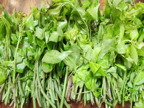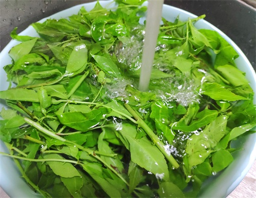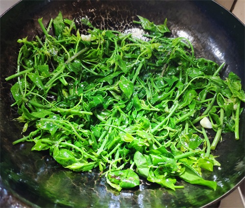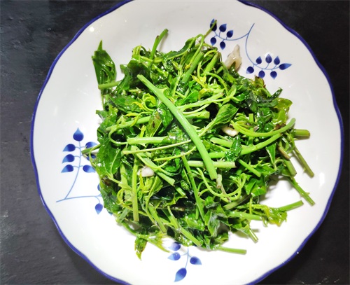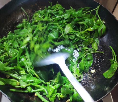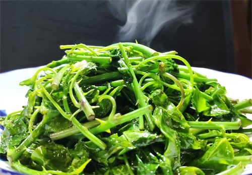 小贴士:采购时选择茎粗壮颜色翠绿的为佳,摘菜时需要注意茎上的小刺。所有的绿色叶子蔬菜下锅时滴几滴料酒,可以保持蔬菜原来的绿色。