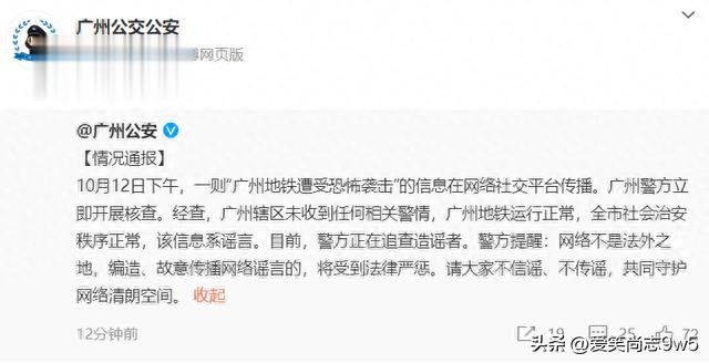 10月12日,网上有消息称,“广州珠海地铁3号线江新城站遭遇恐怖袭击,爆炸瞬间造成多人伤亡”。对此,记者从广州警方获悉,该信息系谣言。目前,警方正在追查造谣者。