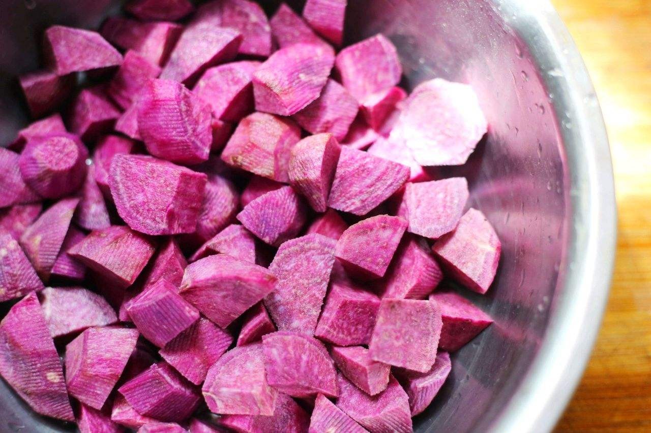 做法:1、我们先把紫薯冲洗干净,沥干水后,去掉紫薯的外皮,再用刀切成小块,放入干净的小盆里面;备用;