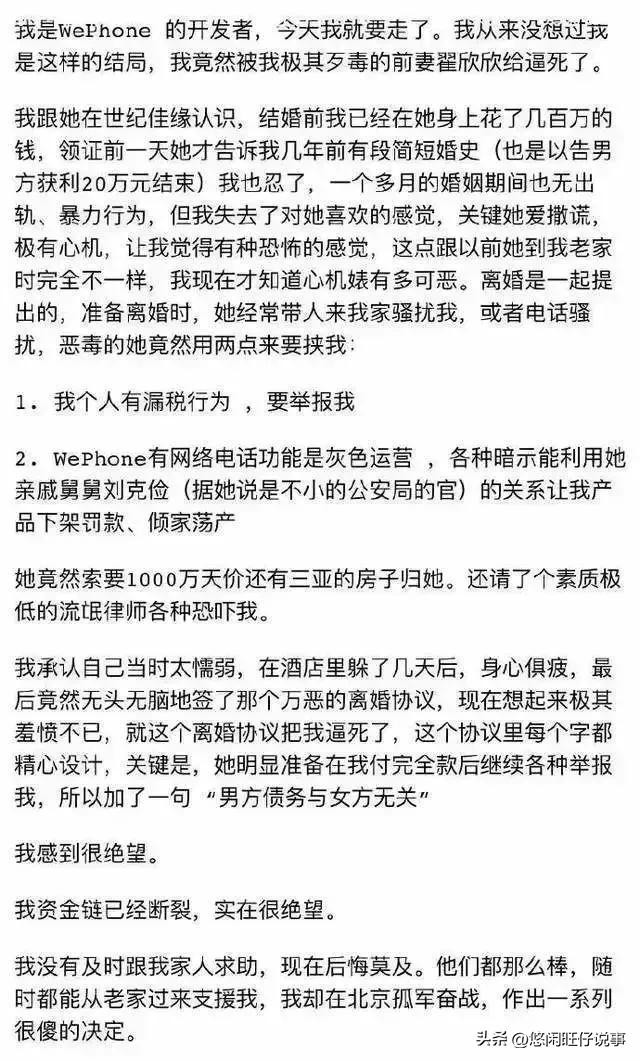 然后翟欣欣就以丈夫偷税漏税行为威胁恐吓,尽管已经给了她巨额补偿,仍是不放过他,签下离婚协议,导致破产,最终让其不堪重负。