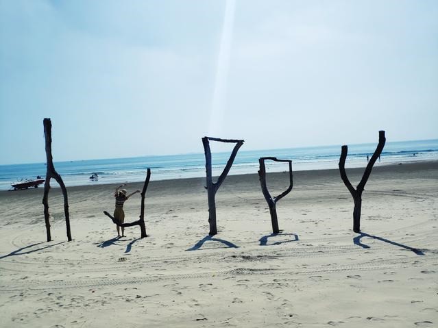 上午沙滩上都没什么人,阳光太强,又恰好被海水反射,刺得人睁不开眼。此时的风景着实差强人意。但好在,我跟小君都属于自寻开心的人。在树枝边尽情的凹造型,反正没人看见,更没人抢镜。又跑到海水里泡脚,享受包场的待遇。